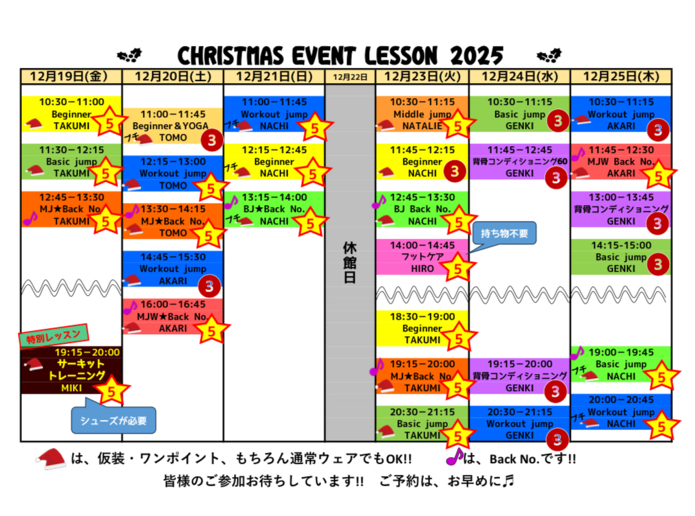 2025.12.16 お知らせ NEW 2025年12月19日〜25日◆クリスマスイベントレッスンのお知らせ◆ 今年もやります!! クリスマスイベントWEEK!! 2025年12月19日〜25日は、イベントレッスンとして、仮装レッスン、バックナンバーや特別レッスンなど、プログラムを変更しています。 みんなで楽しく跳びましょう♬ 皆様のご来館お待ちしています。 =====================