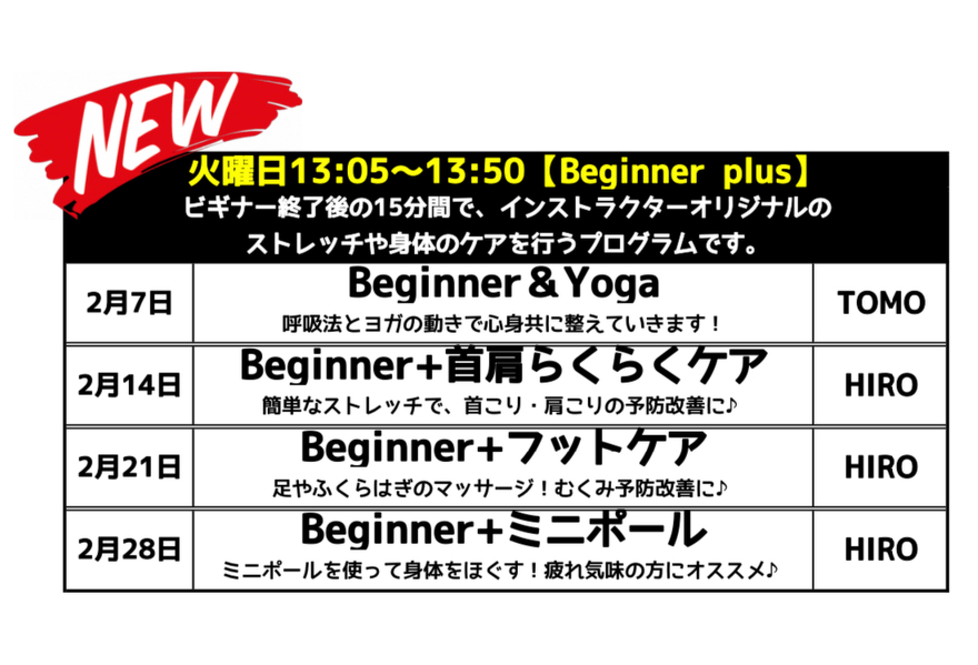 2月から、火曜日のレッスンが変更となります。新しく「Beginner plus」が登場!!