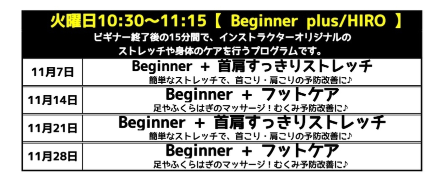 「Beginner plus」は、ビギナー終了後の15分間で、インストラクターオリジナルのストレッチや身体のケアを行うプログラムです。
