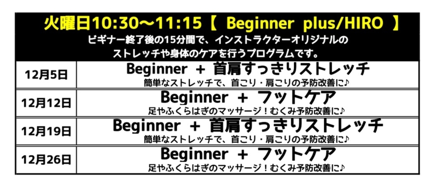 「Beginner plus」は、ビギナー終了後の15分間で、インストラクターオリジナルのストレッチや身体のケアを行うプログラムです。